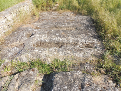 En una losa de granito que no sobresale del suelo, rodeada de campos de cultivo y protegida por un bajo murete, encontramos la necrópolis de sepulturas excavadas en la roca.